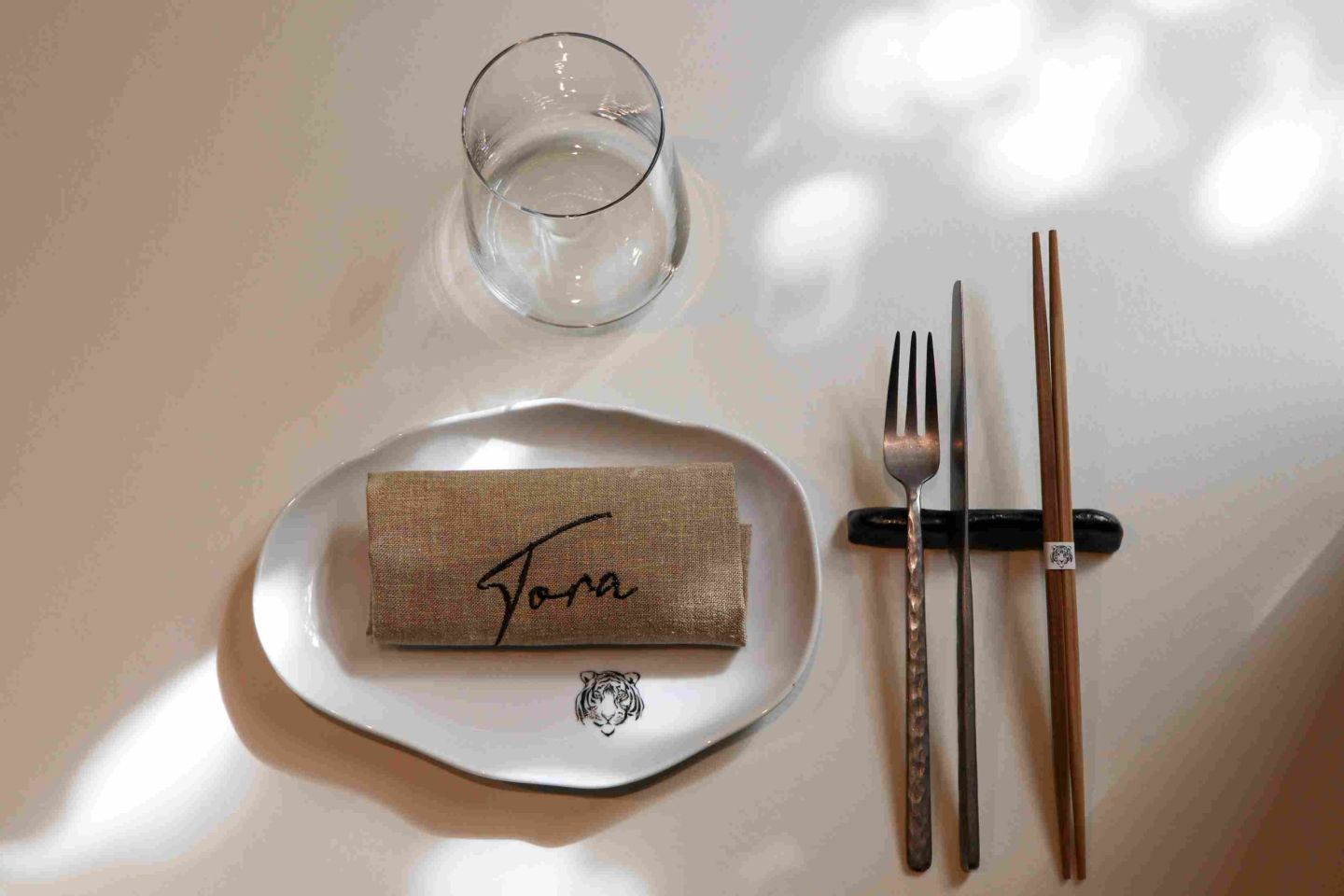 Además, Tora cuenta con una decoración y un ambiente que transmiten paz y tranquilidad. El tigre es uno de los elementos principales que se encuentran en el local y que definen a la propia marca, ya que tora significa tigre en japonés. Este animal se encuentra en los platos, los palillos… Con un punto minimalista y elegante, cada detalle evoca a la cultura asiática.