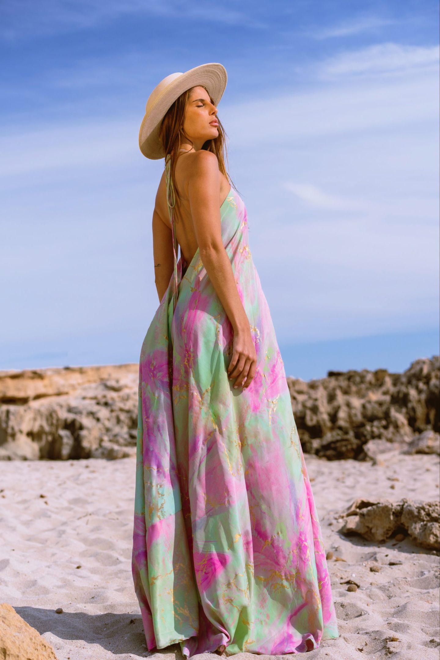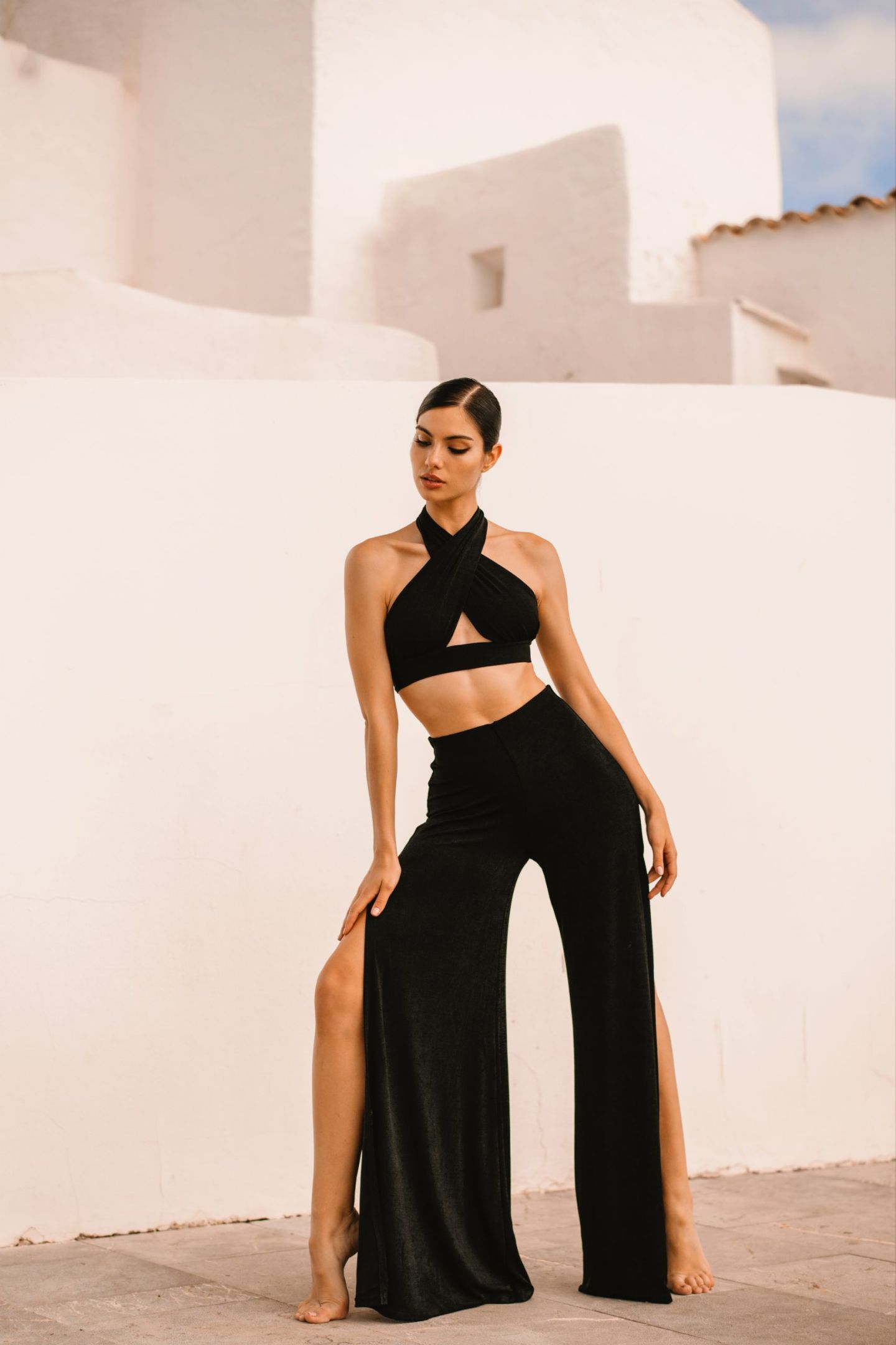 Hay dos series dentro de la colección, una destinada al día y otra a la noche. La de día está formada por una selección de prendas que recuerdan a la vestimenta de los griegos, de corte atrevido, pero con colores tierra y neutros muy sutiles. Son perfectas para viajar a la costa o pasear por la playa. Para esto también sirve una serie de vestidos y sets de top con pantalón corto muy veraniegos y con estampados de colores llamativos.