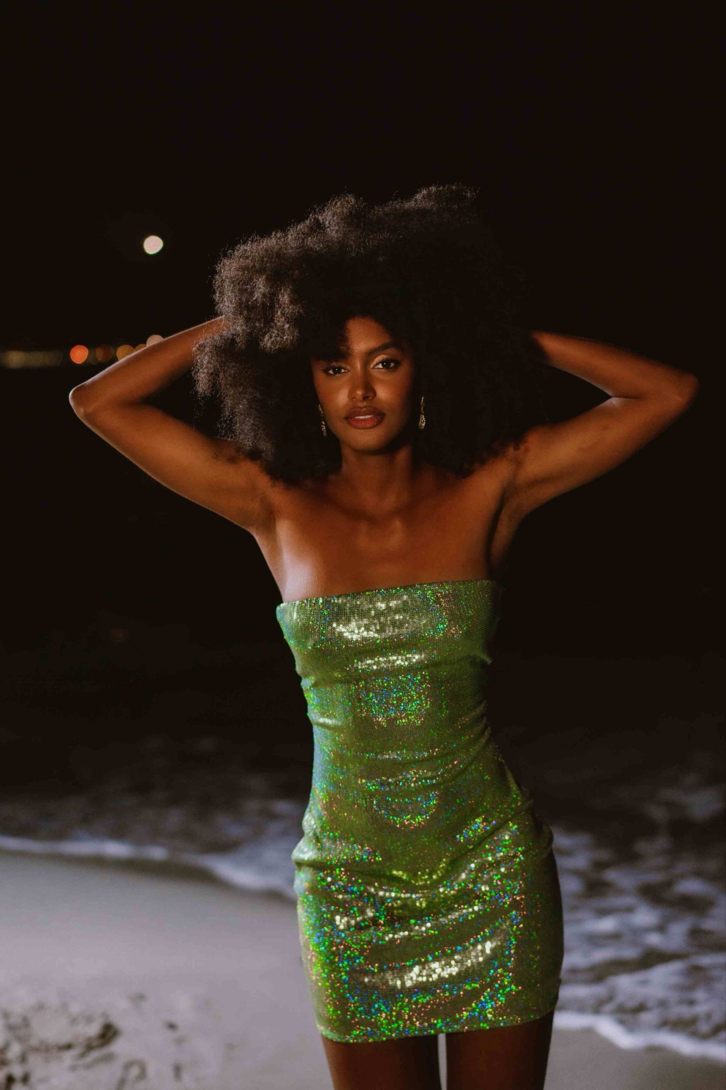 En cuanto a la serie de noche, hay diseños más atrevidos y elegantes. Encontrarás tonos negros, blancos, dorados y verdes. Lo que más destaca de esta selección de prendas son los tejidos. Algunos de ellos son las transparencias, los vestidos con purpurina, los sets de top y falda con lentejuelas o los vestidos plisados.